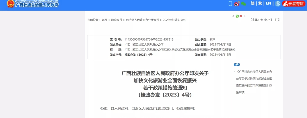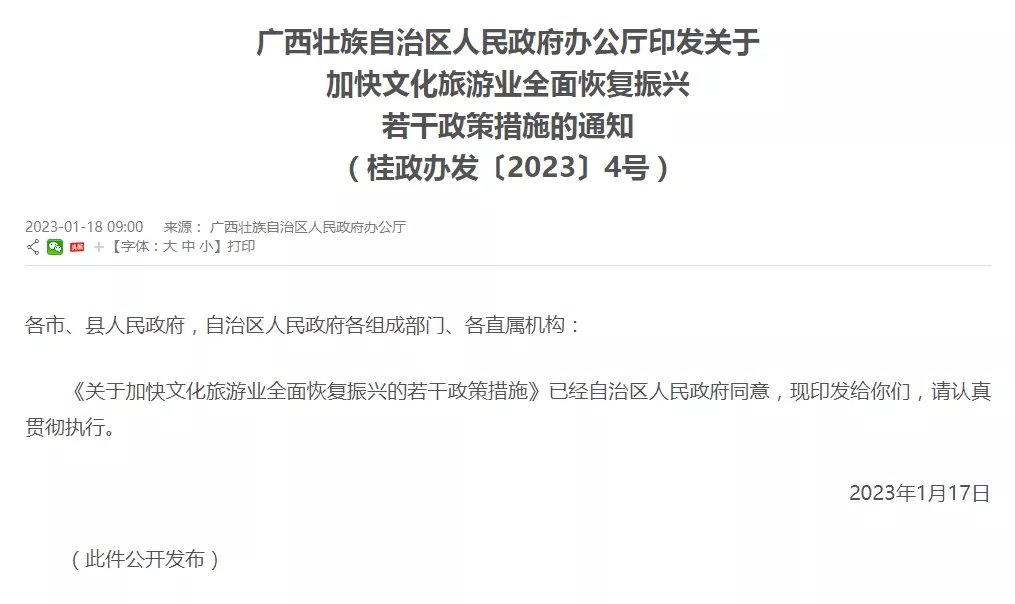 近日,广西壮族自治区人民政府办公厅印发《关于加快文化旅游业全面恢复振兴的若干政策措施》(以下简称《措施》),从全面繁荣假日市场、突出特色产品供给等16个方面提出具体举措,着力推进2023年文化旅游市场全面恢复振兴。