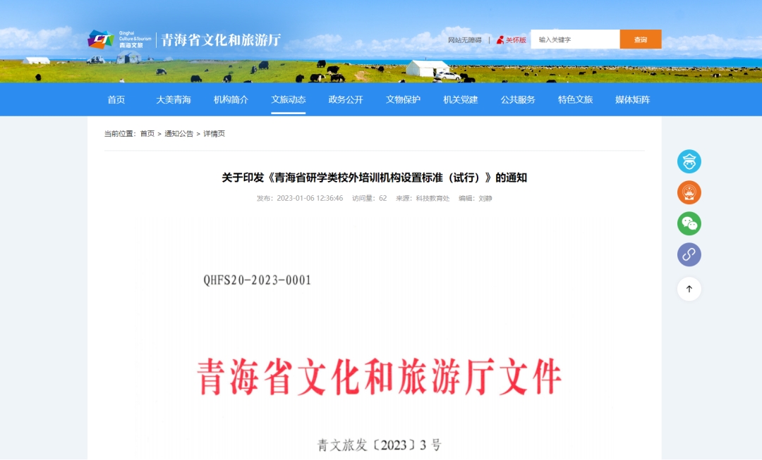 近日,青海省文化和旅游部印发了《青海省研学类校外培训机构设置标准(试行)》的通知(以下简称《通知》)。