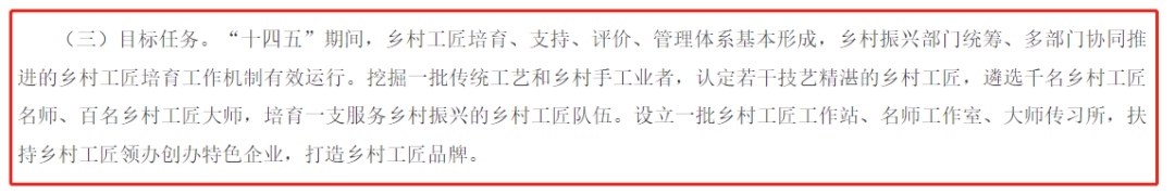 “十四五”期间,乡村工匠培育、支持、评价、管理体系基本形成,乡村振兴部门统筹、多部门协同推进的乡村工匠培育工作机制有效运行。
