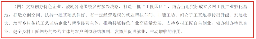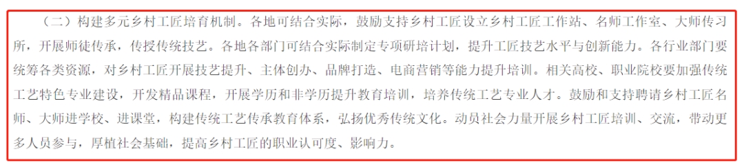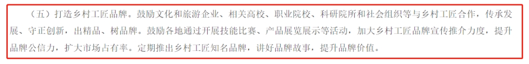 “鼓励文化和旅游企业、相关高校、职业院校、科研院所和社会组织等与乡村工匠合作,传承发展、守正创新,出精品、树品牌……”